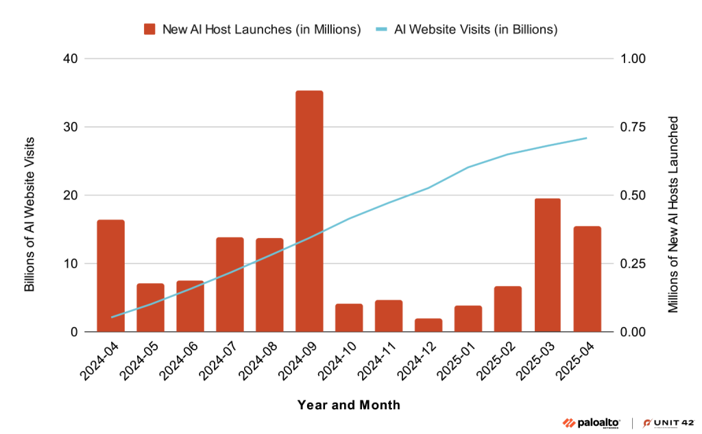 The study reveals that AI website visits have more than doubled within just six months, from April 2024 to April 2025, with threat actors increasingly leveraging these platforms to create convincing malicious content that traditional security measures struggle to detect.