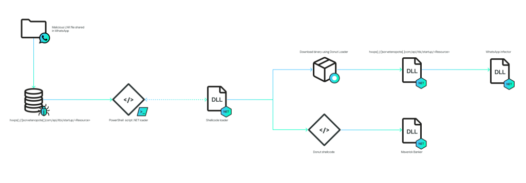 The infection begins when a victim receives a ZIP file on WhatsApp containing a malicious .LNK shortcut disguised as a legitimate document or bank communication.