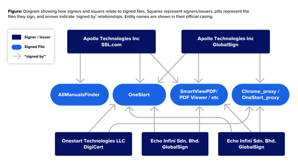 In total, the actors cycled through certificates for companies, including Apollo Technologies Inc., Echo Infini Sdn. Bhd., Summit Nexus Holdings LLC, and Glint Software Sdn. Bhd..