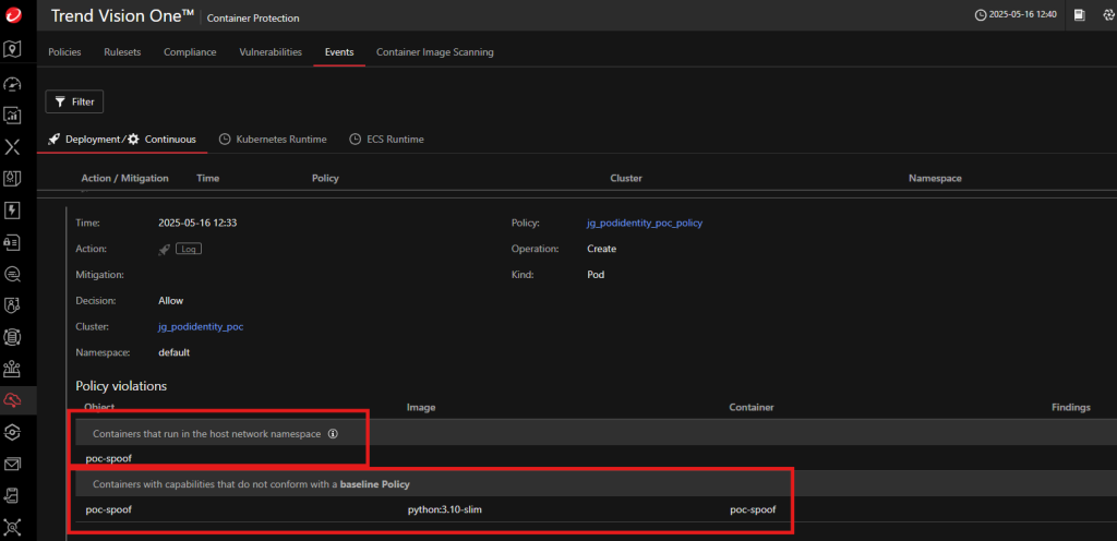 • Trend Vision One policies flagging “containers in host network namespace” or “non-baseline capabilities”