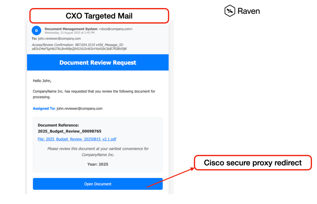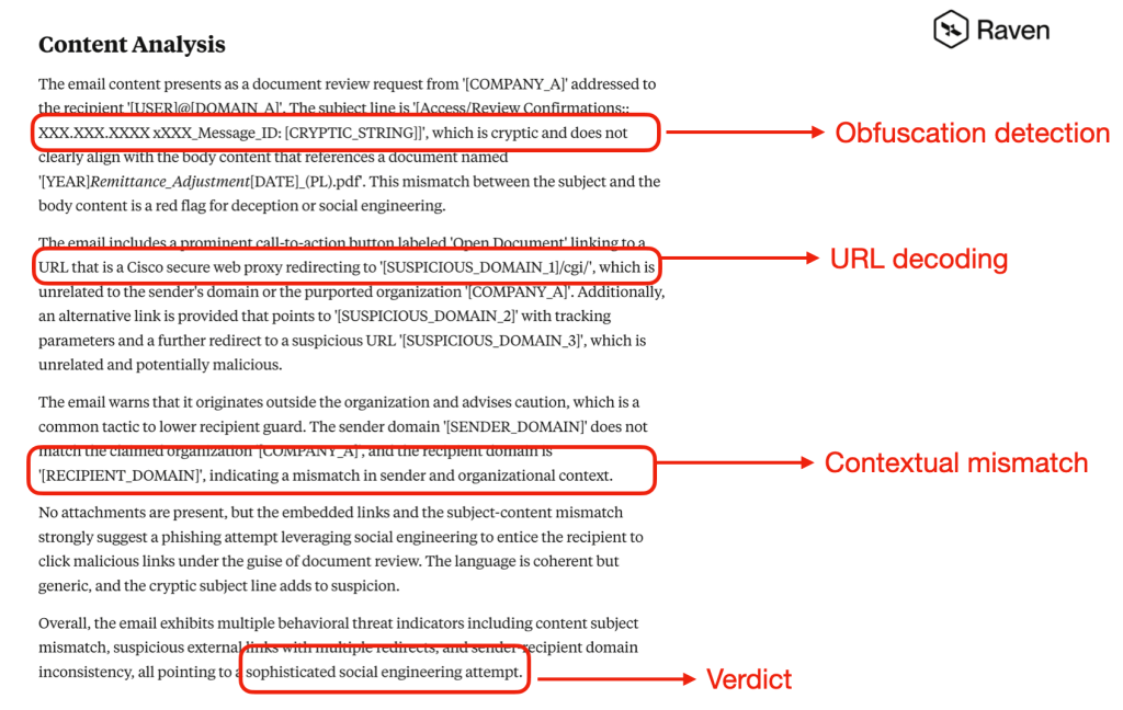 Raven AI’s detection engine identified the campaign through contextual analysis rather than traditional signature-based methods.