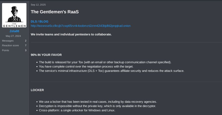 Threat actor zeta88 is actively advertising The Gentlemen’s affiliate program across underground forums, promoting a sophisticated cross-platform ransomware-as-a-service (RaaS) operation targeting enterprise environments.