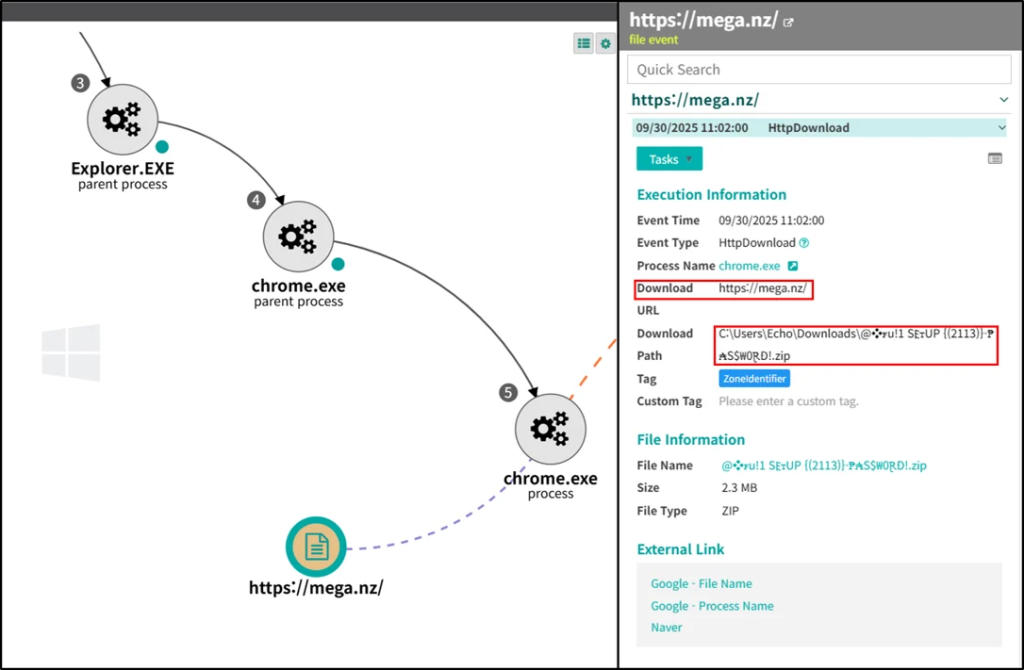 Genian EDR, for instance, visualizes Lumma’s attack storyline, providing visibility into shellcode injection, AutoIt script execution, and network communication events in real time.