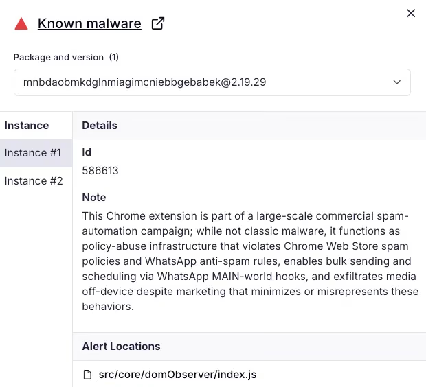 Socket’s AI Scanner flagged one extension, Organize-C (mnbdaobmkdglnmiagimcniebbgebabek), as malware due to its spamware behavior that directly injects code into WhatsApp Web pages.