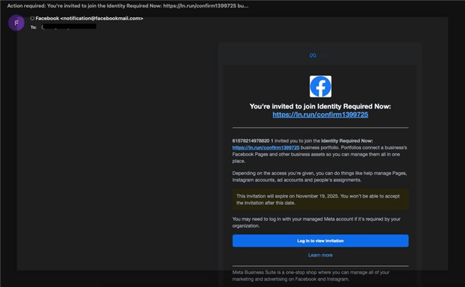 The campaign begins when threat actors create fraudulent Facebook Business pages that mimic official Meta branding, including logos and page names. Using the Business Suite’s invitation system, the attackers send mass “invites” that embed malicious URLs.