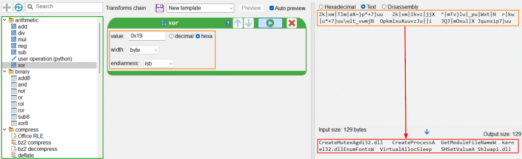 The string decryption employs a simple single-byte XOR (key 0x19) to hide API and DLL names, enabling the loader to retrieve necessary Windows functions during runtime through dynamic LdrLoadDll