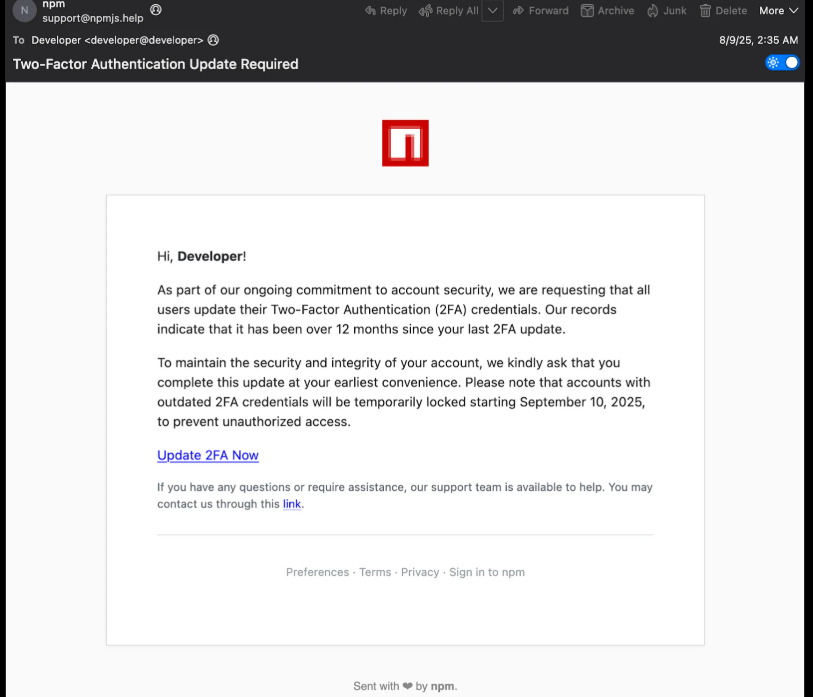 The phishing email, titled “Two-Factor Authentication Update Required,” originated from a spoofed domain, support@npmjs[.]help, and instructed recipients to update their MFA settings to avoid losing access.