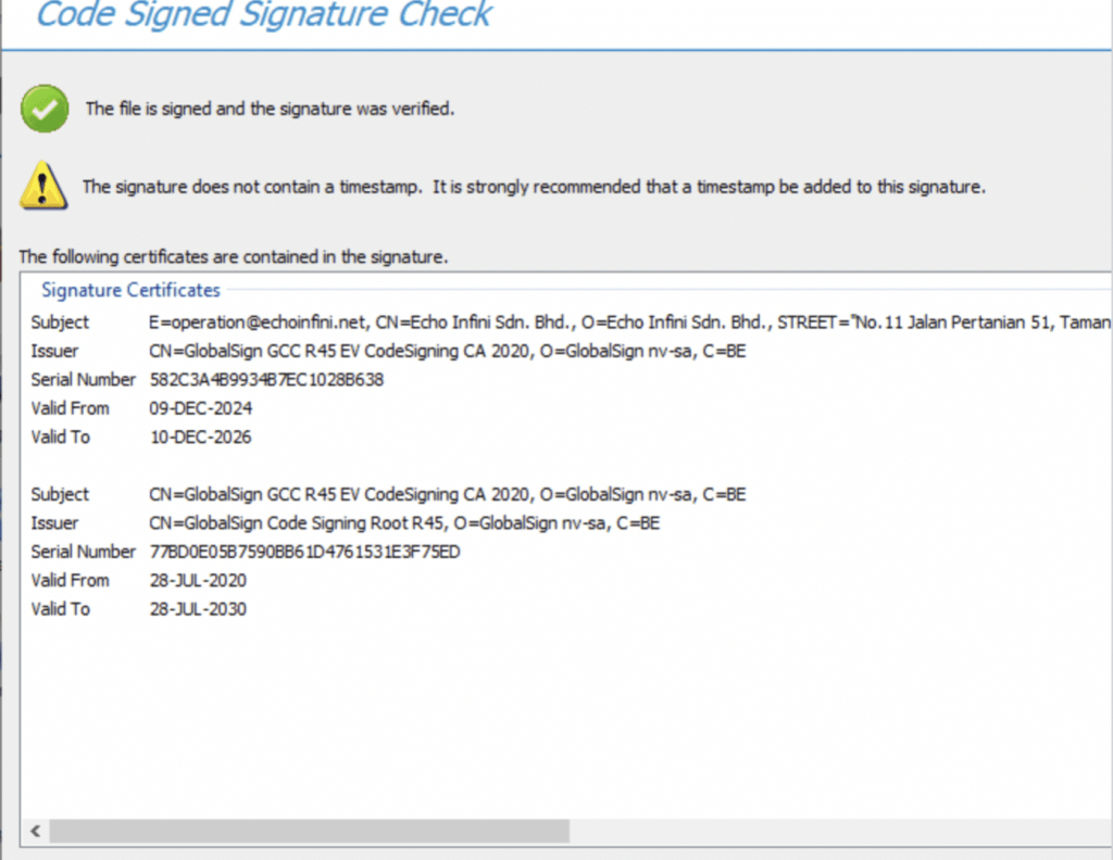 This deliberate staging maximized the user base before activation. The malware was also digitally signed using certificates from multiple shell companies, for example, ECHO Infini SDN BHD and GLINT By J SDN.